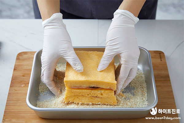 7. 달걀물을 뭍힌 빵을 6면을 돌려가며 빵가루를 입혀주세요.