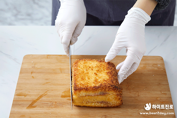 10. 빵을 대각선으로 4등분 잘라주면, 몬테크리스토 샌드위치 완성!