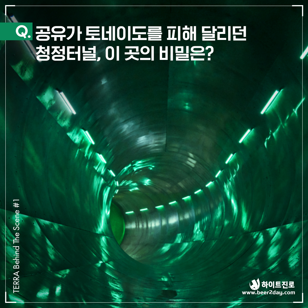 TVC에서 공유가 토네이도를 피해 달리던 청정 터널! 토네이도가 쏟아지는 이곳은 실제로 광고 촬영을 위해 제작된 공간인데요. 알루미늄 소재의 45m라는 긴 청정 터널을 만들기 위해 무려 5일이 걸렸습니다. 테라의 청정 그린보틀 컬러만큼이나 푸른빛이 오묘하면서도 신비로운 분위기를 자아내죠?