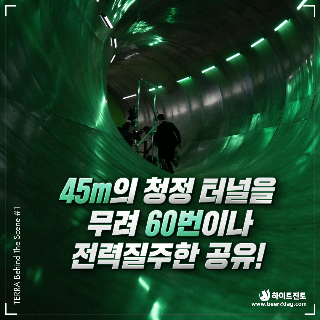 TVC에서 공유가 토네이도를 피해 달리던 청정 터널! 토네이도가 쏟아지는 이곳은 실제로 광고 촬영을 위해 제작된 공간인데요. 알루미늄 소재의 45m라는 긴 청정 터널을 만들기 위해 무려 5일이 걸렸습니다. 테라의 청정 그린보틀 컬러만큼이나 푸른빛이 오묘하면서도 신비로운 분위기를 자아내죠?