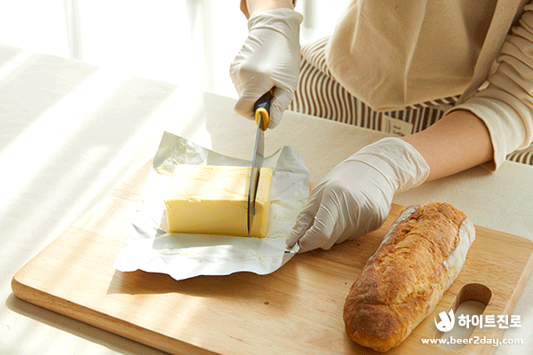 2. 뵈르(가염버터)를 바게트 반 크기에 맞춰 도톰하게 썰어주세요.