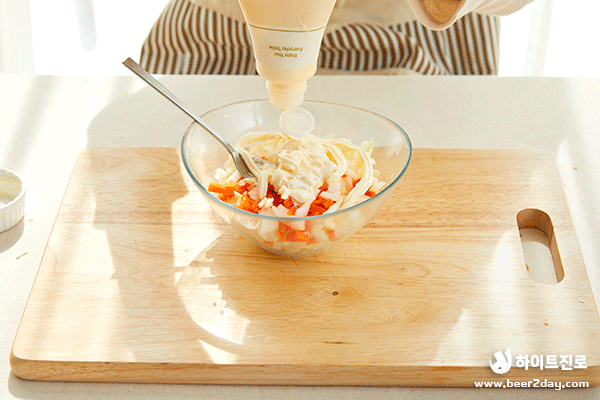 4. 마요네즈 8T, 설탕 2T, 소금 3T, 후추 3T 순으로 넣어주세요.