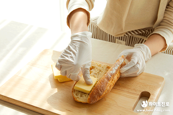 3. 버터를 바게트 빵 사이에 끼워 넣어주세요.