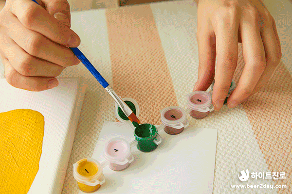 1. DIY 설명서를 확인한 후 물통에 물을 담아 준비하고 캔버스와 아크릴 물감 번호를 확인해주세요.