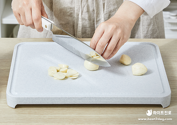 2. 마늘을 편 썰어주고, 대파는 줄기 부분을 다져주세요.