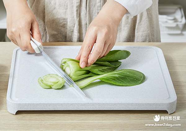 3. 알배추는 한 입 크기로 잘라주고, 청경채는 뿌리 부분을 잘라 다듬어주세요.