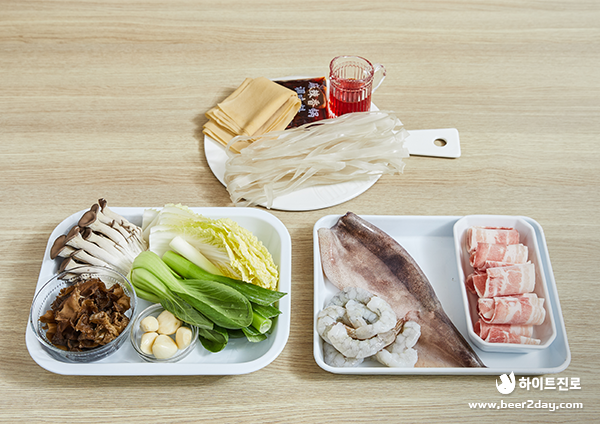 | <마라샹궈 재료/2~3인분 기준> 대파1/2개, 마늘5~6개, 알배추5~6장, 청경채 2개, 느타리버섯 100g, 목이버섯 1/2개, 대패삼겹살 300g, 오징어1마리, 냉동 새우5~6개, 마라샹궈 소스 1봉지, 중국 당면, 건두부, 고추기름 약간 |