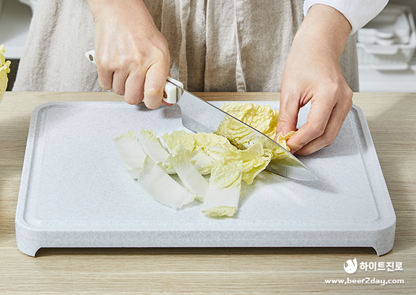 3. 알배추는 한 입 크기로 잘라주고, 청경채는 뿌리 부분을 잘라 다듬어주세요.