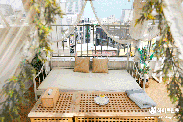 비투지기는 바로 옆 테이블로 이동하여 탁 트인 도심 뷰와 감성 캠핑 인테리어들을 조금 더 즐겨보았습니다. 청정한 미소가 활짝 피어나는 한정판 테라X스마일리 맥주가 술술 들어가는 도심 속 감성 캠핑! 어떠셨나요? 기나긴 이동시간과 캠핑 장비, 세팅 시간 등으로 캠핑을 고민하고 계신 분들이라면 탁 트인 뷰와 감성적인 인테리어 소품들이 가득한 이곳에서 테라X스마일리와 함께 캠핑을 즐겨보세요!