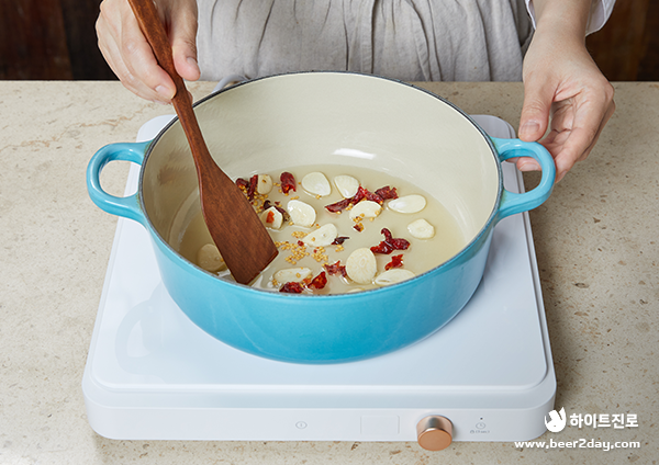 5. 올리브유를 두른 열이 오른 팬에 마늘과 부순 홍고추를 넣고 볶아주세요.