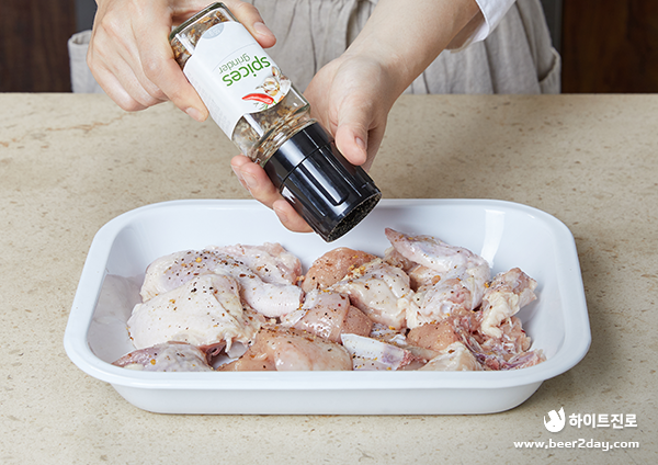 1. 손질된 볶음용 닭에 소금, 후춧가루를 뿌려 30분 정도 밑간 하여 준비해줍니다.