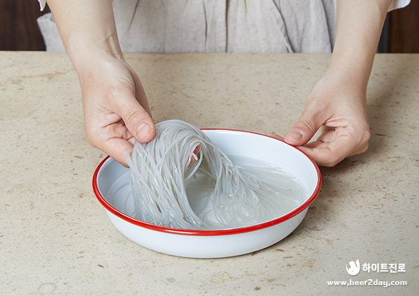 2. 건당면은 찬물에 30분 정도 담가 부드럽게 만들어주세요.
