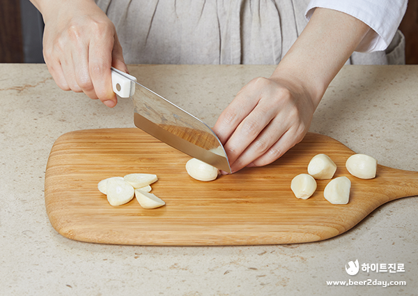 4. 양송이버섯은 2등분으로 손질하고 통마늘은 슬라이스 하여 준비해줍니다.