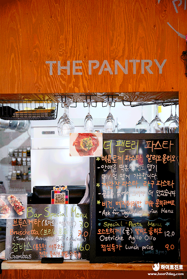 매장 내 인테리어는 이탈리아 요리와 관련된 식료품들로 장식되어 있었습니다. 가게 이름인 팬트리(Pantry)에 걸맞게 ‘식료품 저장실’ 컨셉으로 센스있게 꾸며져 있어 테이블에 앉아 음식을 기다리는 동안 인테리어를 감상하며 마음이 풍족해지는 기분이 들었어요.