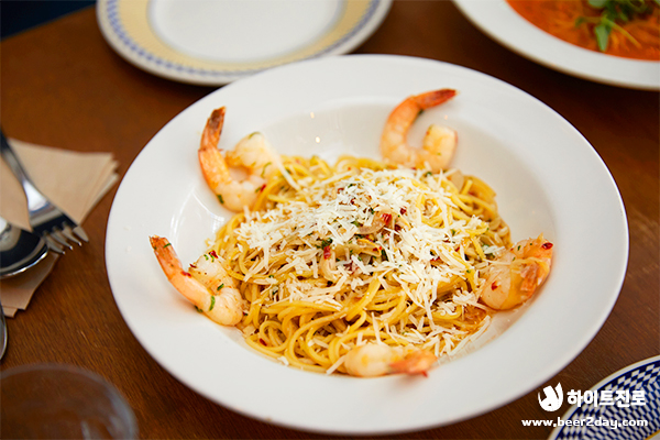 첫 번째로 소개해드릴 메뉴는 ‘새우 알리오올리오’입니다. 베스트 메뉴에 걸맞게 파스타 위에 뿌려진 파마산 치즈가 입맛을 돋워주는 역할을 하고 통통한 새우살과 마늘의 풍미가 아주 환상적인 파스타였어요.