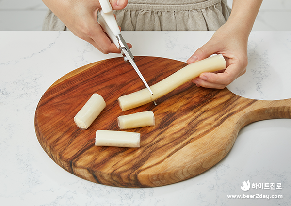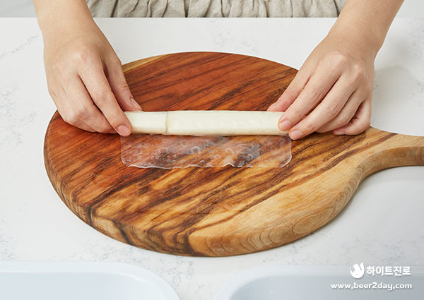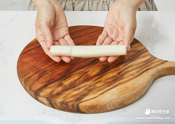4. 치즈 떡을 만들 때엔 스트링 치즈를 라이스페이퍼 길이에 맞추어 잘라 라이스페이퍼 2장에 돌돌 말아주면 됩니다.