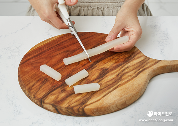 5. 준비한 라이스페이퍼 떡을 3등분으로 잘라주세요.