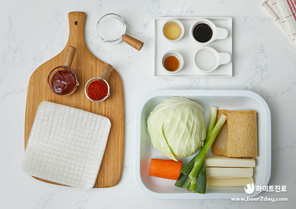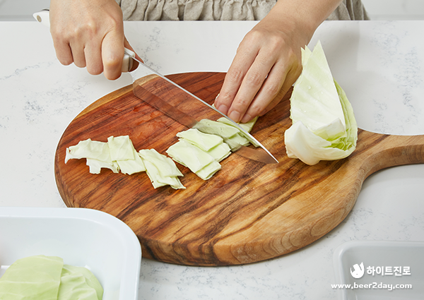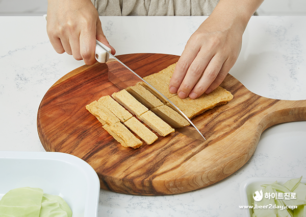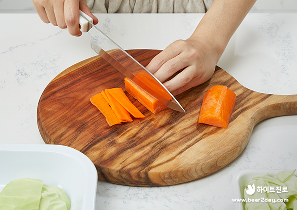 1. 양배추, 당근, 어묵은 한입 크기의 직사각형 모양으로 썰어주세요.