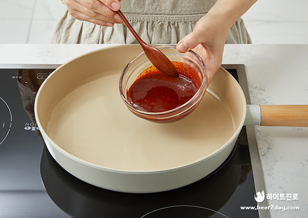 7. 팬에 물을 붓고 준비해둔 떡볶이 양념 재료를 골고루 섞어 준비해 넣어주세요.