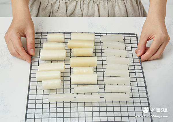 6. 라이스페이퍼 떡들이 서로 달라붙지 않게 채반에 올려주세요.