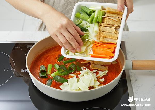 8. 양념 국물이 끓어오르면 양배추, 당근, 어묵, 대파를 넣고 끓여줍니다.