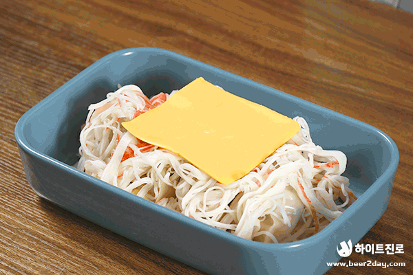 4. 맛살과 까르보나라, 만두가 모두 준비되면 그릇에 까르보나라->만두->맛살을 순서대로 담아주세요.
