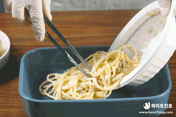 TIP. 까르보나라 면을 가위로 잘라 넣어주면 조리 후 숟가락을 이용하여 쉽게 떠먹을 수 있어요.