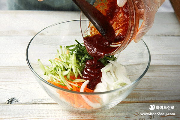 3. 채 썬 채소를 볼에 담고 양념장을 넣어 잘 무쳐줍니다.