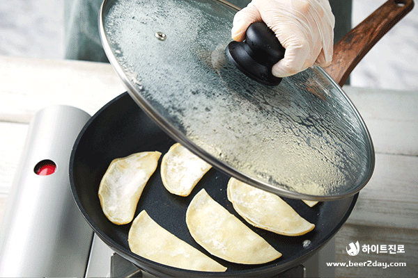 6. 식용유를 두른 팬에 만두피를 올리고 물을 조금 넣은 뒤 바로 뚜껑을 닫고 구워줍니다.