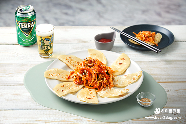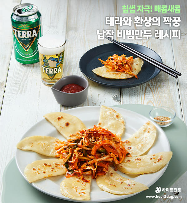 겉바속촉 만두피와 아삭한 채소의 하모니! 만두피에 원하는 만큼 채소를 싸 먹어 보세요. 비투지기는 한 가득~! 넣어 먹었답니다.ㅎㅎ 취향에 따라 채소를 변경하거나 청양고추로 매콤함을 더할 수 있어요. 맛있는 납작 비빔만두와 리얼탄산으로 청량한 테라가 함께라면 젓가락을 멈출 수 없죠. 매콤 새콤한 비빔만두 한 젓가락에 테라 한 모금이라면 이게 바로 행복! 무더위, 테라와 함께 이겨내 보아요!
