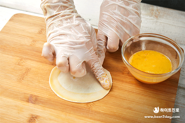 5. 만두피 테두리 반만 달걀물을 바르고 반으로 접어주세요.