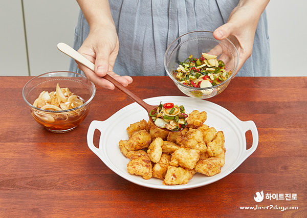 12. 마지막으로 양파 채 양념장을 끼얹으면 깐풍치킨 완성입니다.