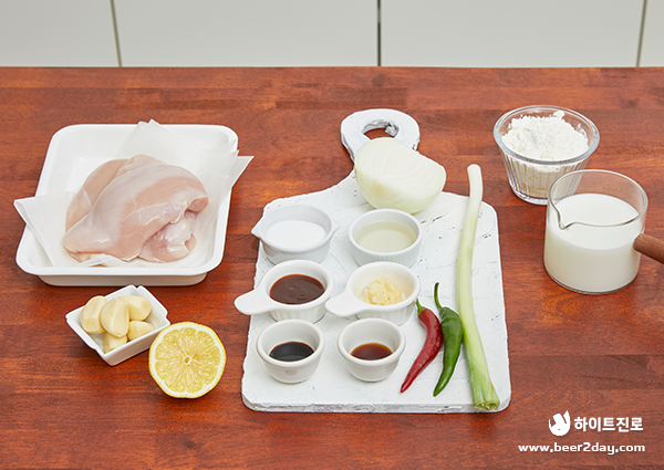 닭가슴살 3토막, 양파 1/2개, 대파 1대, 깐마늘 5톨, 청양고추 1개, 홍고추 1개, 우유 300ml, 1차 튀김 가루 1/2컵, 2차 튀김 가루 1/2컵, 식용유 적당 양, 소금, 후춧가루 약간씩