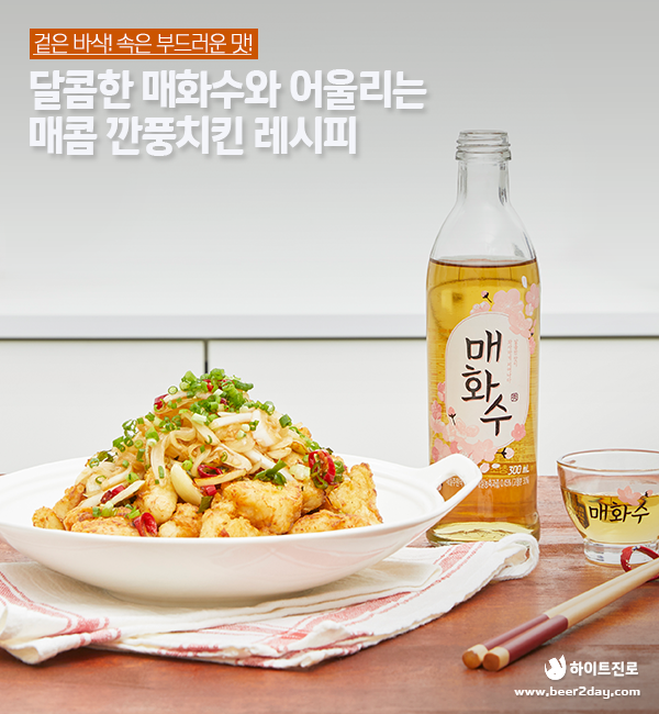 출출함을 달래줄 야식으로 빠질 수 없는 음식, 바로 치킨입니다. 최근 다양한 맛과 특색을 가진 치킨들이 속속 등장하면서 우리들의 행복한 고민은 계속되고 있는데요. 오늘은 그 중에서도 간단한 양념만으로 매콤하고 풍부한 맛을 낼 수 있는 깐풍치킨 레시피를 소개해드리고자 합니다. 그럼 달콤한 매화수와 잘 어울리는 매콤 바삭한 깐풍치킨을 함께 만들어볼까요?