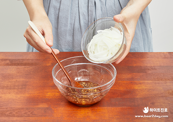 6. 양념장에 채 썬 양파를 넣어 섞어주세요.