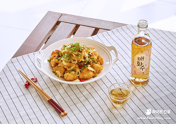 겉은 바삭바삭하고 속은 부드러운 깐풍치킨이 완성되었습니다. 간단한 양념으로 깐풍기의 매콤 달콤한 맛을 구현해보았는데요. 바삭한 튀김 위로 알싸한 소스가 어우러져 풍미 가득한 맛이 입안 가득 느껴지고 대파와 마늘, 청양고추가 어우러지는 소스가 느끼함을 확 잡아주어 계속 손이 갑니다. 매콤한 깐풍치킨에 향긋한 매화수를 함께 곁들이니 그 맛이 배가 됩니다.