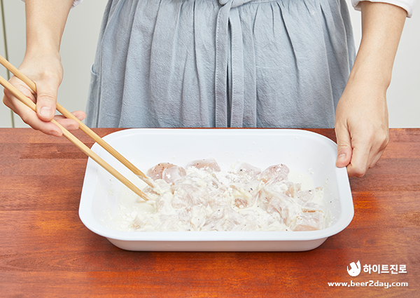 7. 우유에 재운 닭가슴살에 튀김가루 1/2컵을 넣어 버무려 1차로 튀김옷을 걸쭉하게 입혀주세요.