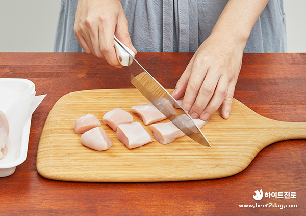 1. 닭가슴살을 먹기 좋은 한입 크기로 썰어줍니다.