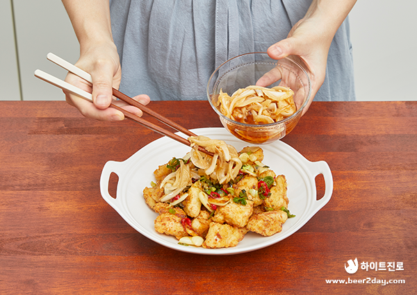 12. 마지막으로 양파 채 양념장을 끼얹으면 깐풍치킨 완성입니다.