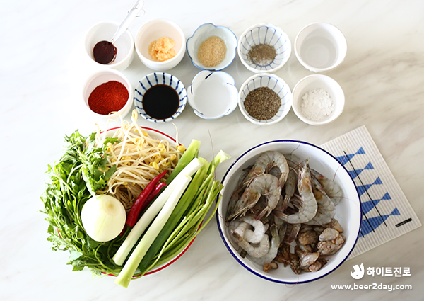 대하 새우 10개, 미더덕 100g, 깐 새우 5마리, 양파 1개(120g), 홍고추 1개, 청양고추 1개, 대파 1대, 찜용 콩나물 500g, 미나리 100g