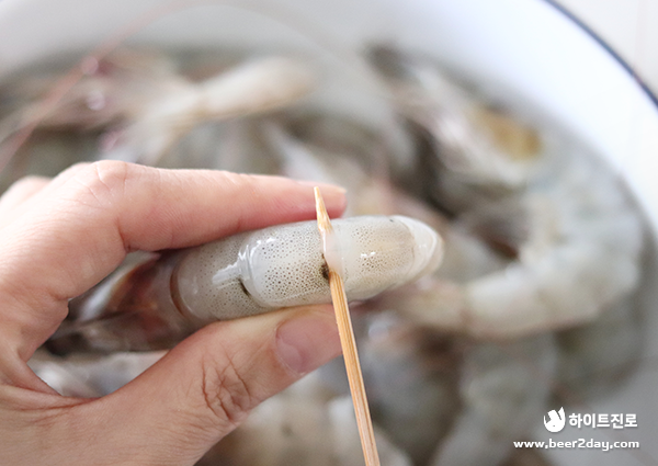 2. 대하는 2~3번째 마디에 꼬챙이를 끼워 넣어 내장을 빼주고 새우 수염은 가위로 잘라 손질해줍니다.