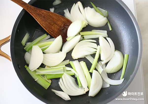 7. 식용유 2큰술을 두른 팬에 대파의 흰 부분을 보통 불에서 1~2분 정도 볶아 파 기름을 내준 뒤, 양파를 넣고 볶아주세요.