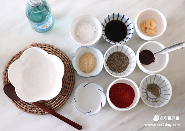 고춧가루 3큰술, 고추장 1큰술, 다진 마늘 수북하게 1큰술, 양조간장 1큰술, 조선간장 ½큰술, 굴소스 1큰술, 진로 2큰술, 생강즙 1작은술, 설탕 ½큰술, 후춧가루 약간, 물 전분(전분가루 1큰술 + 물 2큰술), 들깻가루 약간, 참기름 약간