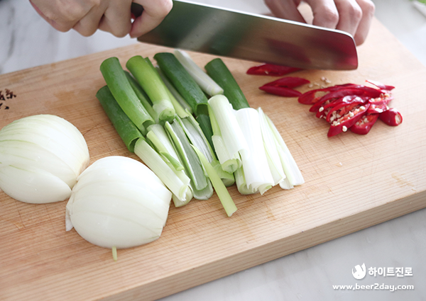 6. 양파는 굵게 썰고 대파는 5~6cm로 썰어줍니다. 홍고추는 어슷하게 썰어 준비해주세요.
