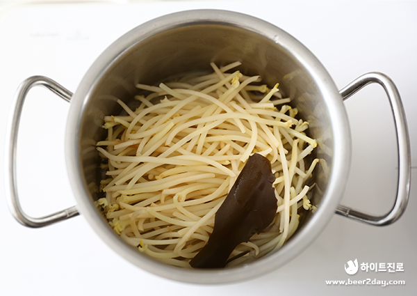 4. 냄비에 콩나물 부피 반의 물을 붓고 다시마 1조각과 소금 1/2 작은술을 넣어주세요. 아삭한 콩나물의 식감을 위해 뚜껑을 덮고 물이 끓으면 불을 바로 꺼주세요. 콩나물을 삶은 물은 아직 버리지 말아주세요!