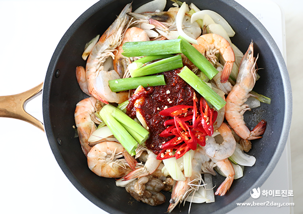 8. 양파가 어느 정도 익으면 새우와 미더덕을 넣고 달달 볶다가 새우가 붉게 변하면 양념장과 대파 푸른 잎, 홍고추를 넣어 센 불에서 볶아줍니다. 이때 콩나물을 삶은 국물도 반 컵 추가해서 볶아주세요.