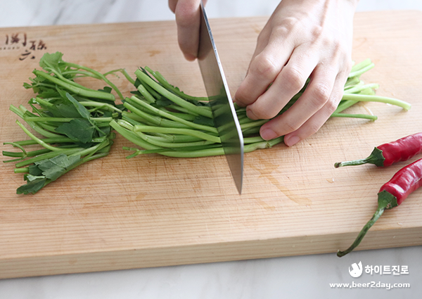 5. 미나리는 식초를 몇 방울 떨어트린 물에 세척하고 5~6cm 길이로 잘라줍니다.