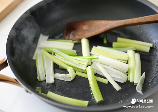7. 식용유 2큰술을 두른 팬에 대파의 흰 부분을 보통 불에서 1~2분 정도 볶아 파 기름을 내준 뒤, 양파를 넣고 볶아주세요.