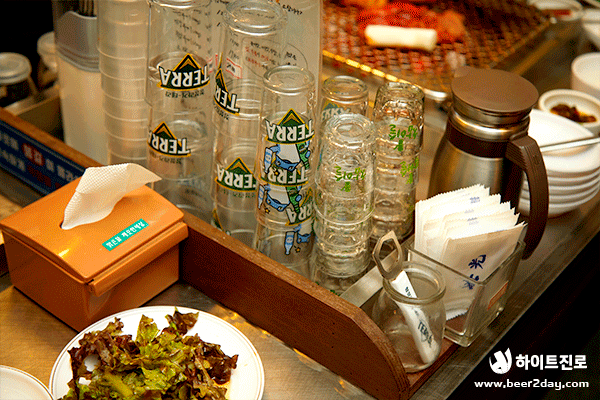 내부 인테리어는 시골에 계시는 할머니 댁에 놀러간 것 같은 아늑한 느낌이었어요. 가게 구석구석 전시된 진로 두꺼비 피규어들과 테이블에 앉으면 바로 보이는 각종 하이트진로 브랜드의 술잔이 눈에 띄네요. 특히나 사장님의 센스가 돋보이는 치실과 머리끈이 가게를 조금 더 친근하게 느낄 수 있도록 도와주는 것 같아요.