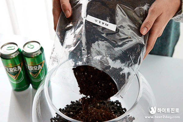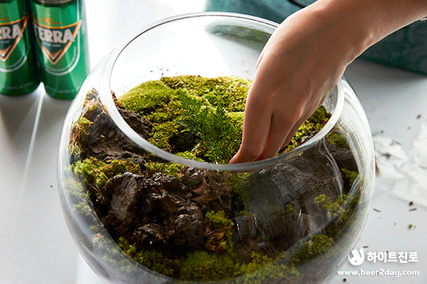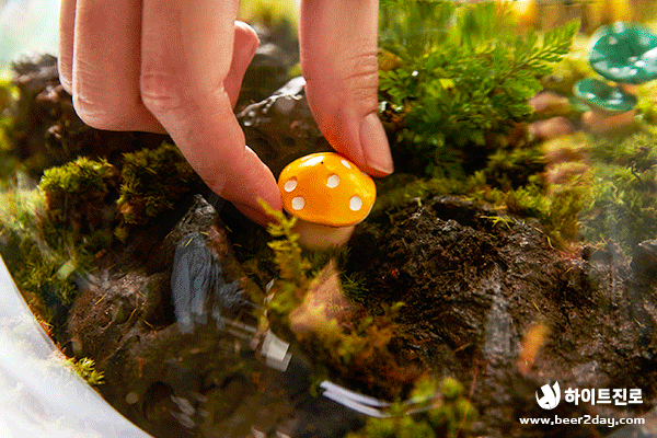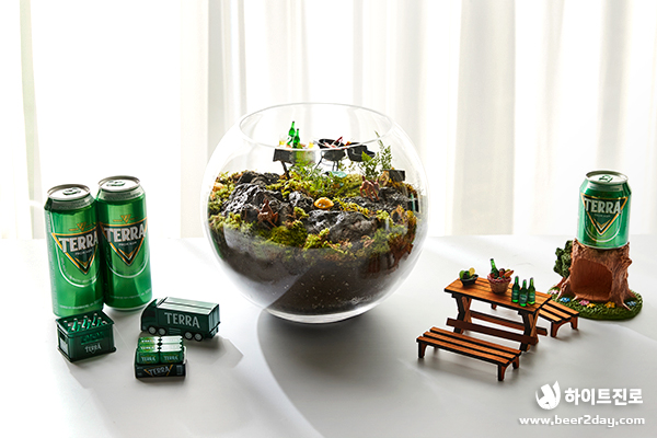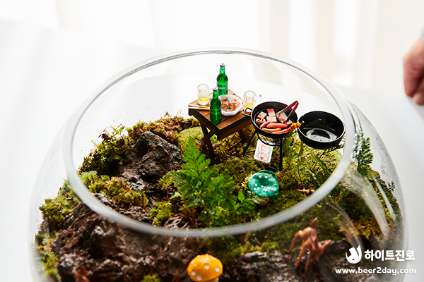 청정, 녹색, 자연하면 떠오르는 것은? 바로 청정라거 테라! 100% 청정맥아, 100% 리얼 탄산으로 테라리움과도 잘 어울리죠! 캠핑, 글램핑 귀여운 버섯, 캠핑 분위기를 연출하는 바비큐 그릴과 테라 미니어처도 넣었어요. 녹색 이끼로 둘러싸인 테라, 영롱하지 않나요?